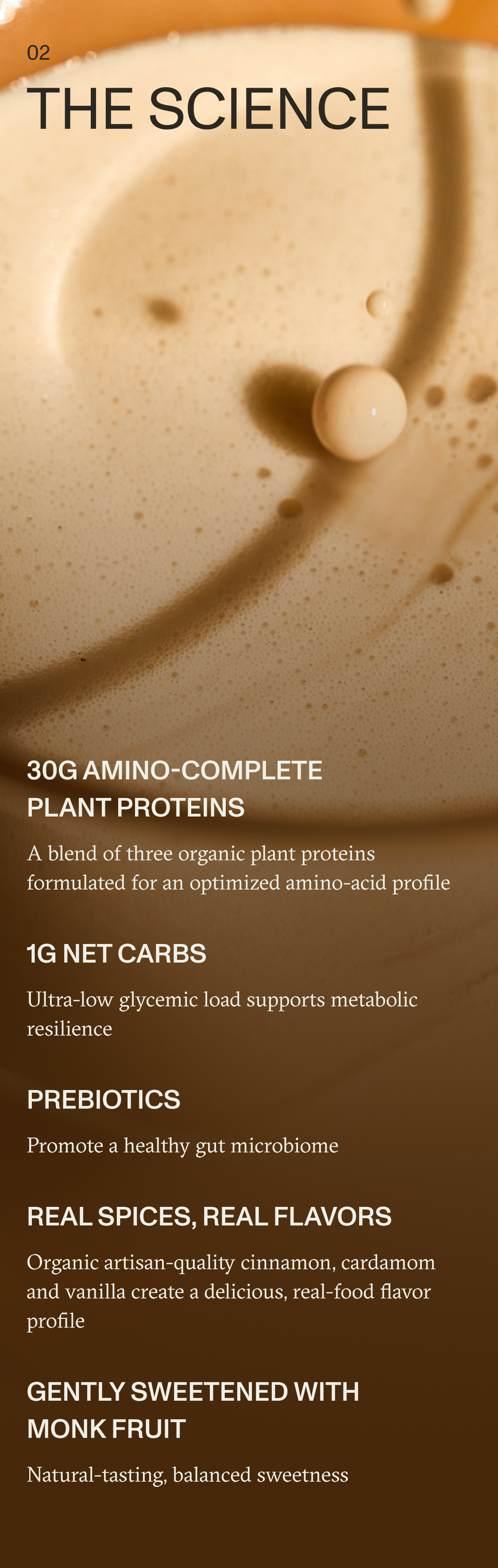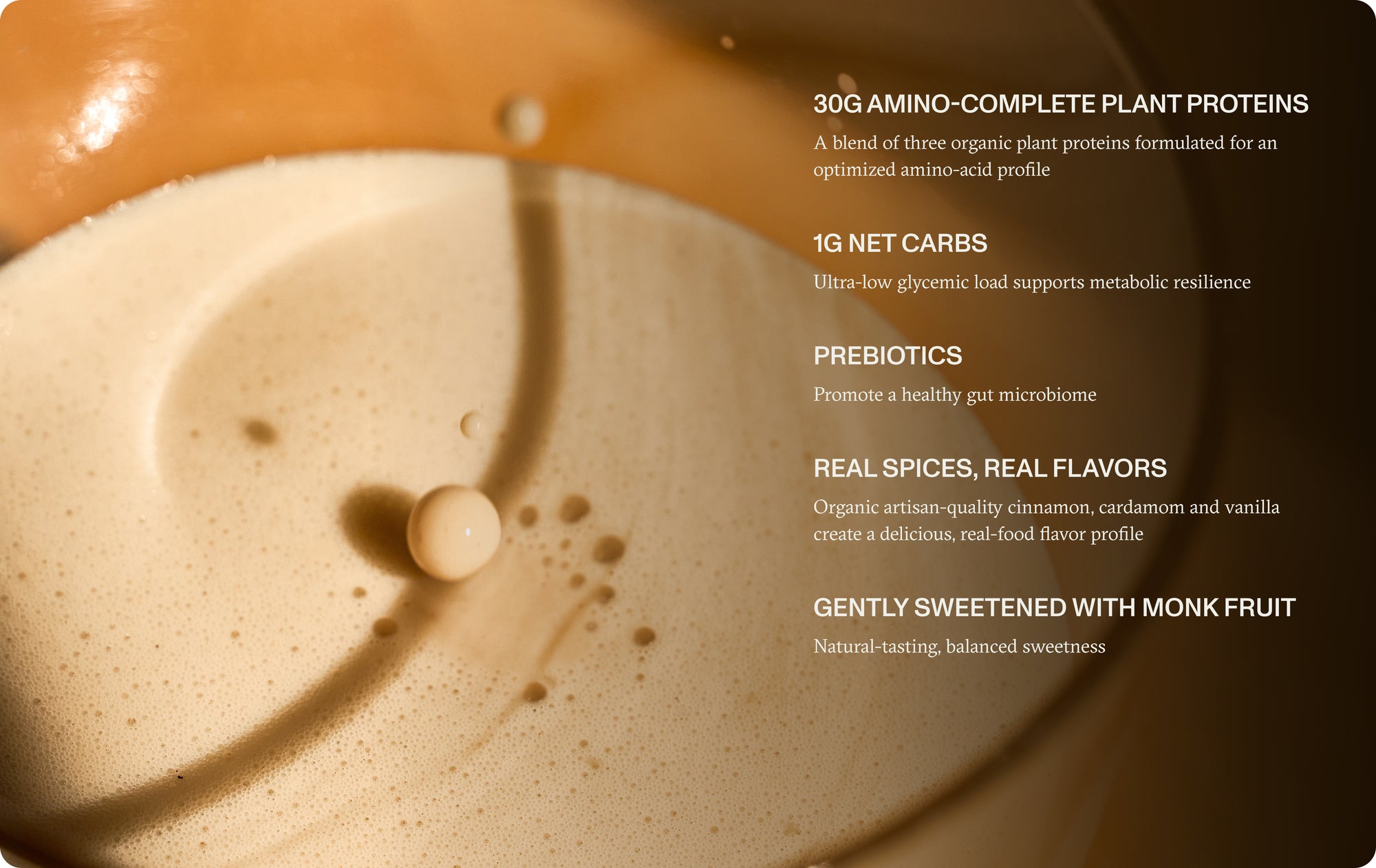 Organic plant proteins, single-origin spices and digestion-supporting prebiotics, tastefully sweetened by monk fruit.
